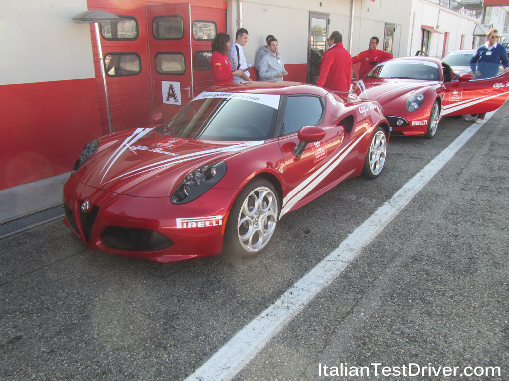 Se pensate che le prove in pista ed i contest siano terminati, vi sbagliate. Dopo avere affrontato molte prove e molti giri di pista arriva uno dei momenti più attesi: la prova su pista dell’Alfa 4C. La 4C si presenta molto più bassa della 8C e delle altre vetture, con una carreggiata molto larga ed un design più irriverente ed estremo, decisamente più “spinto” e deciso. Dopo la prova della 8C ammetto che ero già abbondantemente appagato, ma ovviamente ero molto curioso di vedere come si sarebbe comportata in pista la 4C e come sarebbero state le prestazioni del 4 cilindri 1.750 da 240 CV dopo aver provato un 8 cilindri con quasi il doppio della potenza. Salire a bordo della 4C è più impegnativo rispetto alla sorella maggiore a causa della minore altezza da terra, ma all’interno la posizione di guida è perfetta e la visuale ottima. Nonostante gli interni della 4C siano stati spesso criticati per la carenza di design e materiali, in realtà le plastiche sono ben fatte e c’è tutto quel che serve, insieme al bellissimo carbonio a vista. Il suono del 4 cilindri è aggressivo e graffiante al minimo, mentre sul rettilineo esplode con una violenza ed ignoranza uniche. La 4C è maledettamente incollata all’asfalto e in nessuno modo la si mette in crisi. Ogni curva è affrontata quasi con facilità e anche entrando forte, la 4C è incollata all’asfalto, senza un’imperfezione o un’indecisione. I cambi di direzione sono perfetti e precisi e l’assenza del servosterzo permette di assaporare ogni asperità e particolarità del tracciato, avendo sempre la certezza di sapere dove sono le ruote.