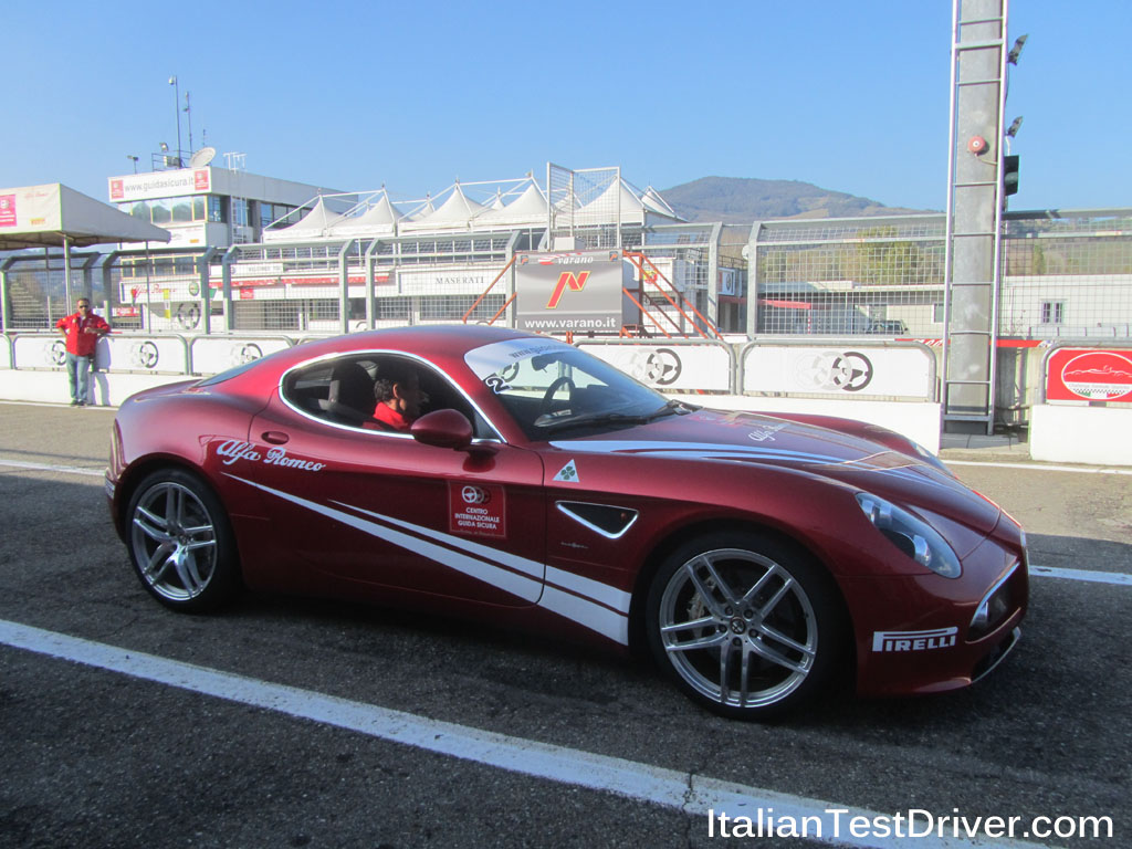 Al termine della guida positiva su tracciato stretto, si torna in pista nuovamente sulla Giulietta Quadrifoglio da 240 CV (ultima versione 2014) caratterizzata da una spinta ed una dinamica di guida decisamente superiore alla prima versione da 230 CV. Ma l’adrenalina inizia a salire a mille quando si sente il ruggito dell’Alfa Romeo 8C Competizione in lontananza, per poi vederla arrivare ai box con un’eleganza ed una sportività che se in foto possono essere splendide, in realtà sono fantastiche. Nonostante sia stata presentata nel 2007, non sembra abbia sulle spalle quasi 8 anni, ma sembra che sia stata lanciata da pochi mesi. Le linee sono uniche: filanti, moderne, eleganti e sinuose, con una vista laterale che ricorda un tratto perfetto di una matita che non è mai stata staccata dal foglio. A bordo, l’abitacolo ti avvolge e ti obbliga a guardare unicamente i 100 metri di fronte a te dato che i sedili sono molto bassi. Dall’interno, la vista dell’anteriore è davvero particolare, grazie ai passaruota marcati e al cofano basso, le quali rendono l’anteriore ancor più sinuoso, al limite della pornografia. Già nel percorrere i 100 metri della pit lane il suono del V8 entra nell’abitacolo in modo deciso e minaccioso come a voler dire “non hai sentito ancora niente”.