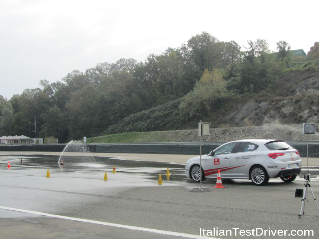 La seconda prova per migliorare le propria guida prevede un percorso “a otto” delimitato da coni, molto stretto e con curve insidiose, non solo perchè secche e a gomito, ma perchè alcune sono rese scivolose dall’acqua. La prova è realizzata per evidenziare l’importanza dei sistemi di sicurezza e di controllo come ABS, ASR, VDC ed EBD e anche in questo caso, il contest prevedeva di concludere un giro veloce in meno di 27″ secondi mantenendo uno stile di guida pulito e sicuro. Il segreto è frenare sempre a ruote dritte e affrontare la curva facendo scorrere la vettura, per poi aprire il gas in progressione fino alla curva successiva. Questo perchè nel caso in cui si affronti la curva accelerando sia in percorrenza che in uscita, l’elettronica taglia la potenza alle ruote per mantenere la vettura in traiettoria, con una conseguente perdita di decimi preziosi per il tempo finale. La vettura era nuovamente una Giulietta Quadrifoglio da 230 CV che si è dimostrata agilissima in questo tracciato, che ha visto (ovviamente) numerosi coni volare in aria.