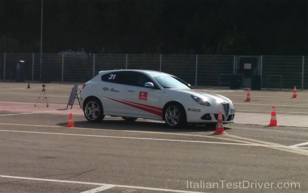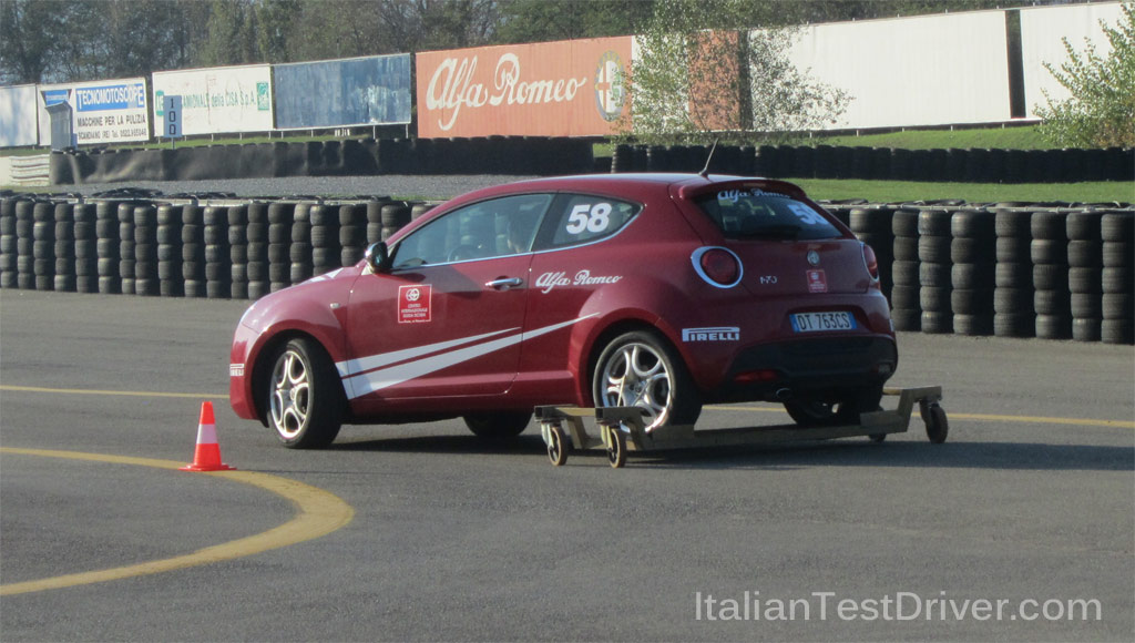 La prova successiva prevedeva un giro cronometrato su un altro circuito ad otto delimitato sempre da coni, a bordo di un’Alfa MiTo 1.4 litri da 120 CV con una particolarità: le ruote posteriori sono sollevate da terra e appoggiate su un apposito carrello che simula situazioni a scarsa aderenza come neve o ghiaccio. La prova è davvero insidiosa e sfinente per la sua difficoltà, dato che occorre correggere ogni metro la direzione dello sterzo, agire sull’acceleratore per riportare la vettura in traiettoria ed effettuare tutte le curve in controsterzo. La prova è resa ancor più difficile a causa dei coni inseriti esattamente in traiettoria in uscita di curva ed è molto facile quindi colpirli (penalità di 5″ secondi). La prova è stata intensa e sul filo del secondo, ma sono riuscito a vincere la prova e portare a casa il trofeo del primo posto! Piccole soddisfazioni che diventano importanti in prove di questo genere.