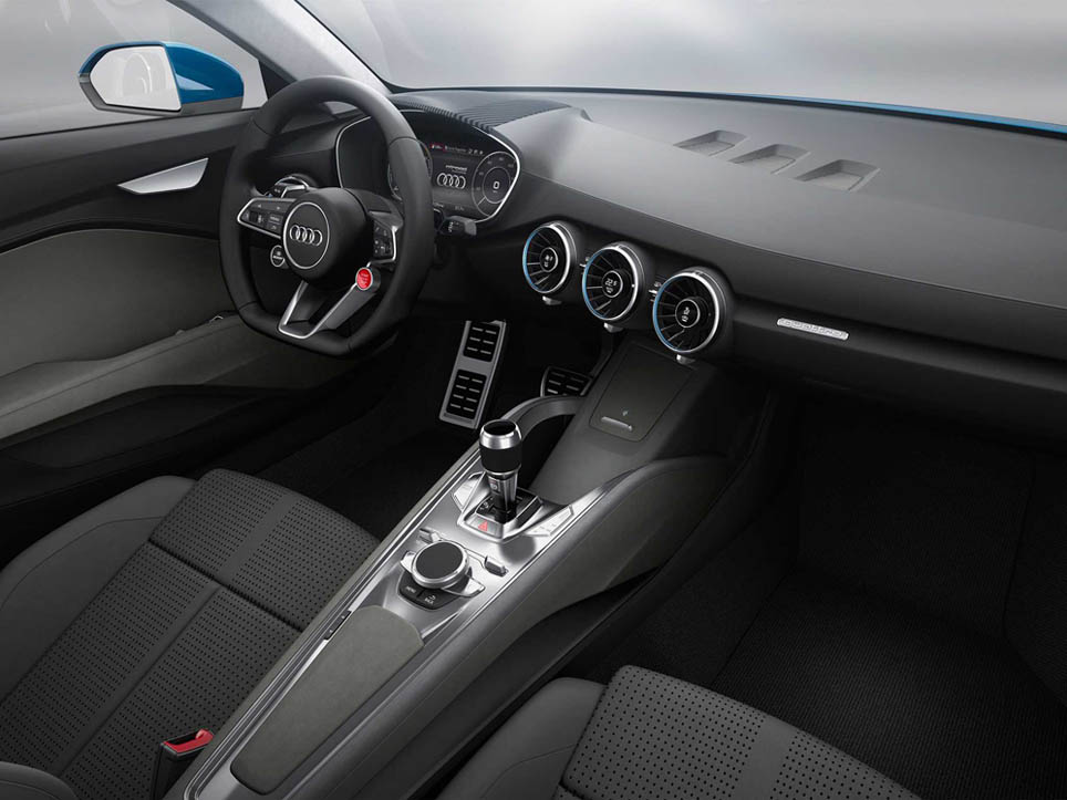 Gli interni sono moderni e ricercati, ma allo stesso tempo caratterizzati da un design semplice e da una plancia minimal. Il cruscotto è composto da un unico schermo LCD che riporta contagiri, contachilometri e tutte le informazioni della vettura. Al centro sono state inserite tre bocchette di ventilazione, nelle quali è integrato il climatizzatore. Il tunnel centrale è moderno e sportivo e le linee generali anticipano quelli che saranno gli interni della nuova Audi TT. Il sistema per la gestione della piattaforma offre tre modalità: Hybrid, Sport ed EV, a seconda delle esigenze del pilota.