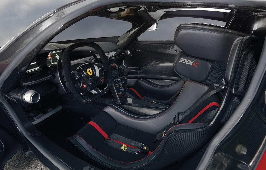 Gli interni della Ferrari FXX K sono fortemente racing, con volante squadrato (già presente su LaFerrari) e nuovi sedili con protezioni laterali per la testa dei passeggeri, in modo tale che durante un eventuale indicente le teste di pilota e passeggero non subiscano brusche decelerazioni laterali e collidano tra loro. nella foto è presente solo una parte delle protezioni laterali; l’altra parte infatti è fissata alle portiere in modo tale da facilitare l’accesso all’abitacolo. Una volta chiusa la portiera, la testa sarà protetta su entrambi i lati. Nell’abitacolo tutto è ridotto all’osso con carbonio a vista e tramite il manettino posto sul volante è possibile scegliere fra 5 diverse impostazioni che riguardano l’intervento di Differenziale elettronico E-Diff, il controllo di trazione F1-Trac, il controllo elettronico dell’angolo di assetto con specifica calibrazione per gli pneumatici slick (Racing SSC) el’ ABS prestazionale. Inoltre si possono impostare ulteriori aspetti della hypercar tramite un apposito quadro strumenti posto sul tunnel centrale. Un vero tripudio di carbonio, pelle e alcantara, per veri amanti delle porn-car.