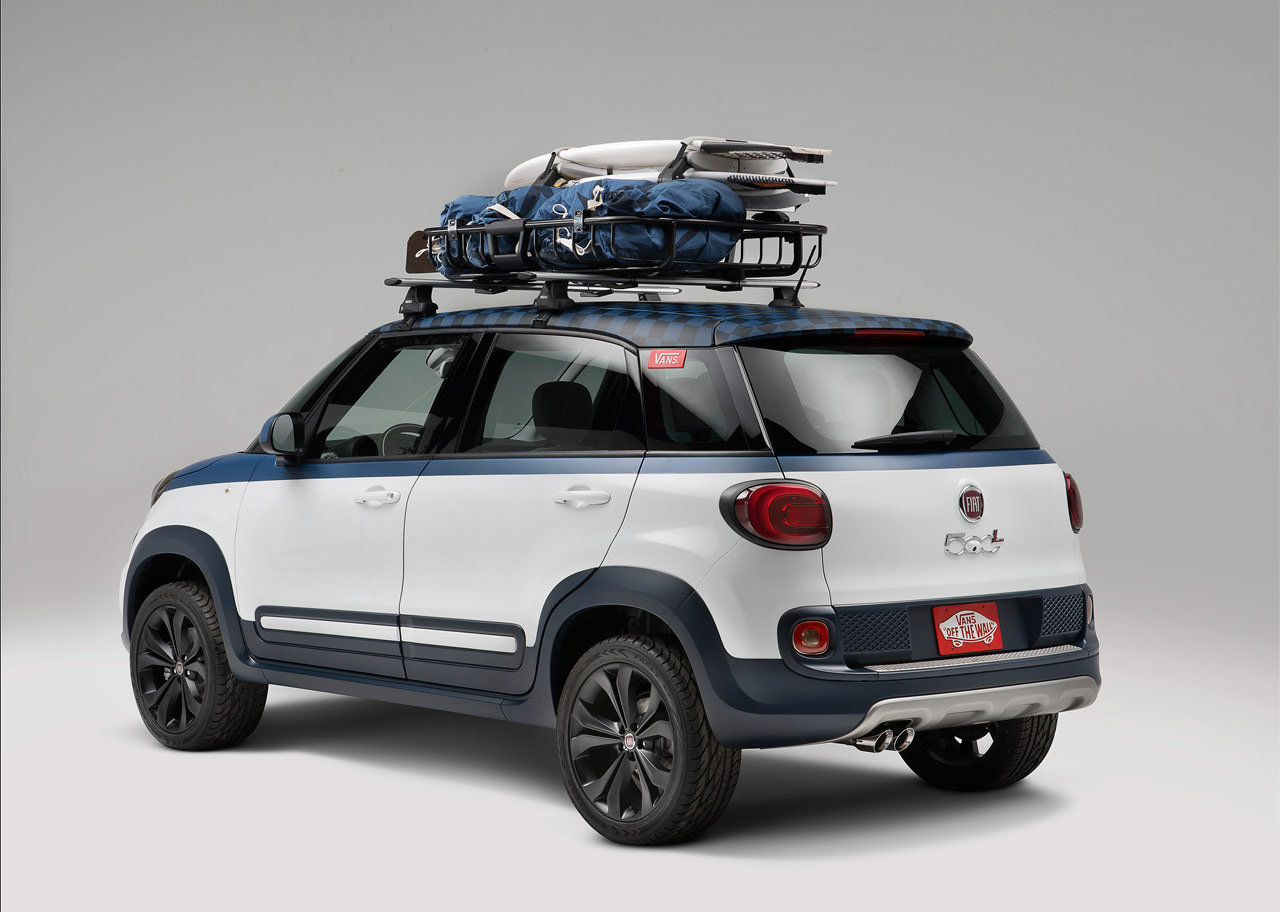 In occasione del Vans US Open of Surfing a Huntington Beach, competizione dei surfisti in California, Fiat ha presentato la Fiat 500L Vans Concept, versione dedicata ai surfisti e ispirata alla celebre marca di scarpe “Vans” partner dell’evento. La 500L Vans presenta un frontale ispirato ai fuoristrada, con nuove e inedite luci circolari a LED, carrozzeria bicolore bianco e blu, cornice protettiva lungo tutto il perimetro della vettura e barre portatutto sul tetto. Inoltre, fari anteriori, luci diurne, baffo cromato con logo Fiat ed i cerchi in lega sono bruniti, per infondere un aspetto più moderno e deciso alla 500L, mentre il tetto presenta uno stile a scacchi nero e blu. Se gli esterni ricordano lo stile Vans in alcuni dettagli, gli interni invece riprendono fedelmente tutte le soluzioni stilistiche delle scarpe e degli zaini, come la plancia con grafica in stile vintage molto colorata, sedili bianchi e blu in tela e pedaliera e vani portaoggetti rivestiti dalla “suola Waffle” che ritroviamo nelle scarpe. La Fiat 500L Vans è dedicata ai surfisti ed è equipaggiata con il 1.4 turbo da 160 CV, abbinato al cambio manuale a 6 marce.