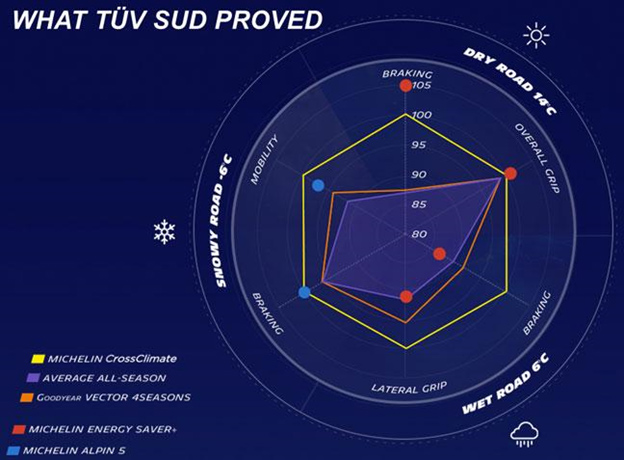 Michelin CrossClimate è stato anche testato su strada da TÜV-SÜD, con risultati davvero notevoli: su fondo asciutto sono dei perfetti pneumatici estivi e superano in performance sia gli pneumatici invernali che gli all seasons.