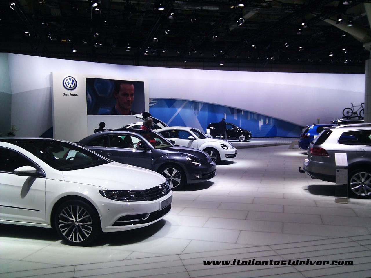 Lo stand Volkswagen è ampio e ben realizzato. All’inizio sono poste una Golf R in tinta Blu a fianco di una Passat station Wagon. Presentata inoltre la nuova Volkswagen CC, la quale non si chiamerà più Passat CC, ma solo “CC”. Al centro dello stand trovano posto 3 Maggiolino: il primo con verniciatura nera con allestimento Turbo, il secondo sempre in allestimento turbo ma in tinta bianco e stripes Nere ed il terzo in colorazione Grigia. Posta in posizione sopraelevata rispeto alle altre vetture troviamo la Piccola Up!, la vettura dalle grandi aspettative di Volkswagen. Le Up! esposta era in colorazione nero lucido ed interni del medesimo colore. Esternamente lo stile è pulito ma fin troppo “piatto” e difficilmente riesce ad emozionare. Le stesse considerazioni si possono affermare per l’abitacolo, dallo stile minimal e dalle plastiche di media fattura. A fare da sfondo troviamo un Volkswagen Tuareg Hybrid ed un Polo che ha preso parte al WRC 2011.