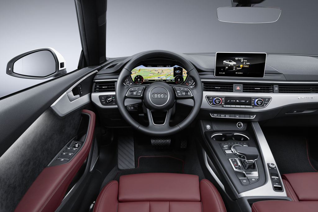 Come tutte le Audi di ultima generazione, gli interni della A5 Cabrio sono caratterizzati dal cruscotto completamente digitale Audi Virtual Cockpit, insieme al rotary posto di fronte alla leva del cambio che permette di inserire la destinazione sul navigatore e di spostarsi nel Menu dello schermo centrale.