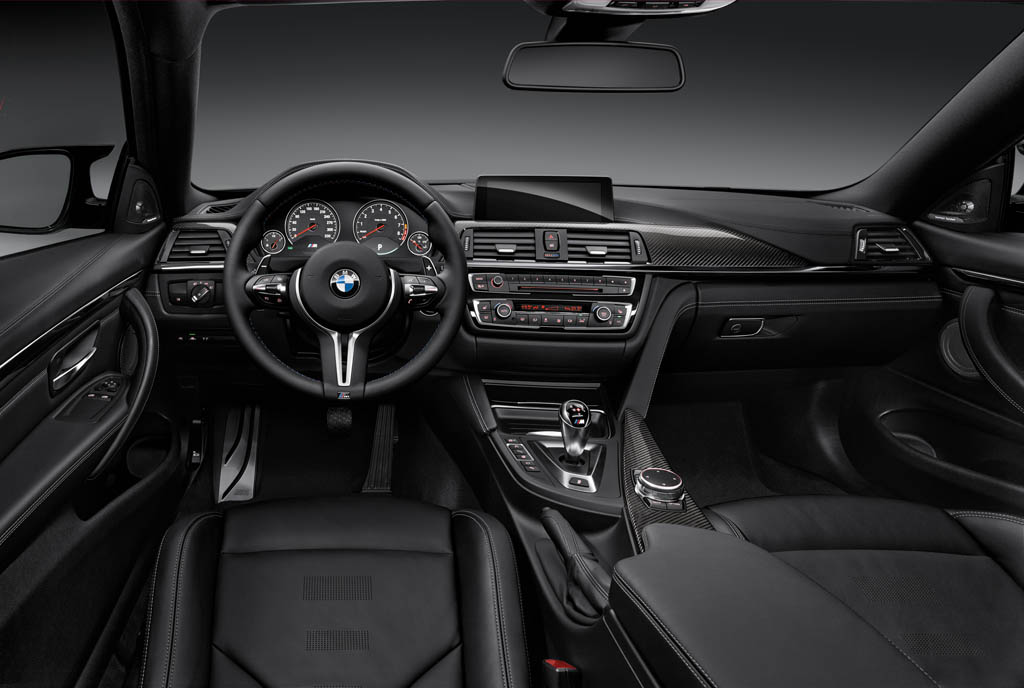 Gli interni della BMW M4 Coupè offre un abitacolo più sportivo rispetto alla BMW Serie 4 Coupè da cui deriva, mantenendo ugualmente l’eleganza BMW. Il logo “M” è stato inserito su volante, leva del cambio e batticalcagno, mentre inserti in fibra di carbonio sono stati inseriti su tunnel centrale e plancia. La sportività viene enfatizzata grazie al volante sportivo a tre razze e ai sedili sportivi in pelle molto contenitivi, con il logo M illuminato. Anche il divanetto posteriore è stato sagomato per essere più contenitivo, mentre il bagagliaio ha una capacità di 445 litri. Nel caso i cui si voglia portare la BMW M4 Coupè in pista, BMW offre l’applicazione BMW M Laptimer, la quale permette di visualizzare e registrare sul proprio smartphone velocità, numero di giri del motore, consumo di carburante, marcia inserita del cambio automatico, accelerazione longitudinale e trasversale, angolo di sterzata, posizione del pedale dell’acceleratore e il consumo di carburante, e tempo sul giro. Il sistema di infotainment integra il navigatore Professional 3D, il Driving Assistant Plus, l’High Beam Assistant e l’Active Cruise Control.