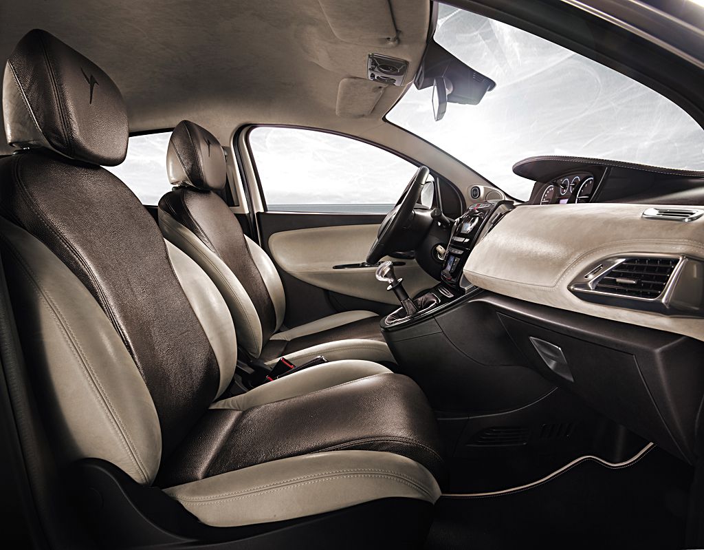 Il tema del bicolore è presente anche all’interno dove il chiaro dell’Alcantara che riveste il padiglione, in tono con la verniciatura dei montanti e delle pantine parasole, trova il suo contraltare nelle tonalità scure della parte inferiore della plancia e soprattutto nella morbida e ricca pelle nera che ricopre volante, “palpebra”, cuffie del cambio e del freno a mano. Connotazione di alta sartoria, quindi, rafforzata anche dalle doppie cuciture e ricami sia a contrasto che a tono. Infine, in perfetta sintonia con gli esterni, il trattamento “eco-chrome” ritorna all’interno sulle cornici delle bocchette, sulla maniglia del cassetto, sulle leve apri-porta, sulle razze del volante e sulla cornice del cambio. Quest’ultimo, poi, è reso ancora più esclusivo da un pomello realizzato in metacrilato con effetto cristallo che, proprio come un prezioso gioiello, rinvia al naming della show-car Lancia.