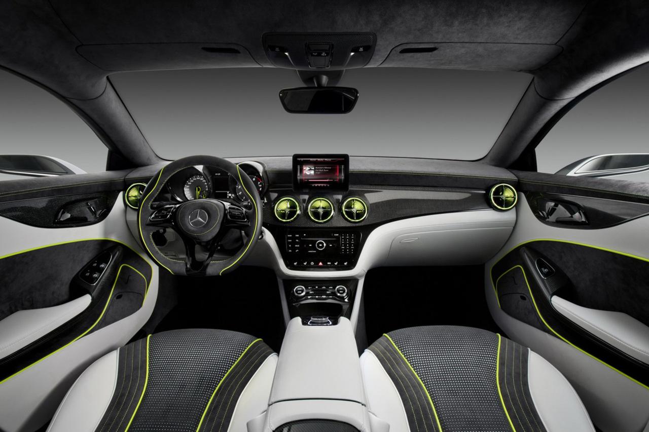 Gli interni della nuova Mercedes Concept Style Coupè sono ricercati e dal design fortemente sportivo. La plancia riprende fedelmente quella della Mercedes Classe A, con bocchette di aerazione dalla forma circolare, volante sportivo a tre razze rivestito in alcantara ed elementi a contrasto di colore giallo. Al centro della plancia, interamente in carbonio, è stato inserito lo schermo touch screen del sistema multimediale Mercedes Comand Online, il quale permette di gestire tutte le informazioni della vettura. I sedili e la parte inferiore della plancia sono rivestiti in pelle Nappa bianca, contribuendo a rendere l’abitacolo più sportivo. Il carbonio è stato inserito anche nel tunnel centrale e nei pannelli porta. Al posteriore i posti sono due, con ampio spazio per le gambe e la versatilità delle 4 porte.