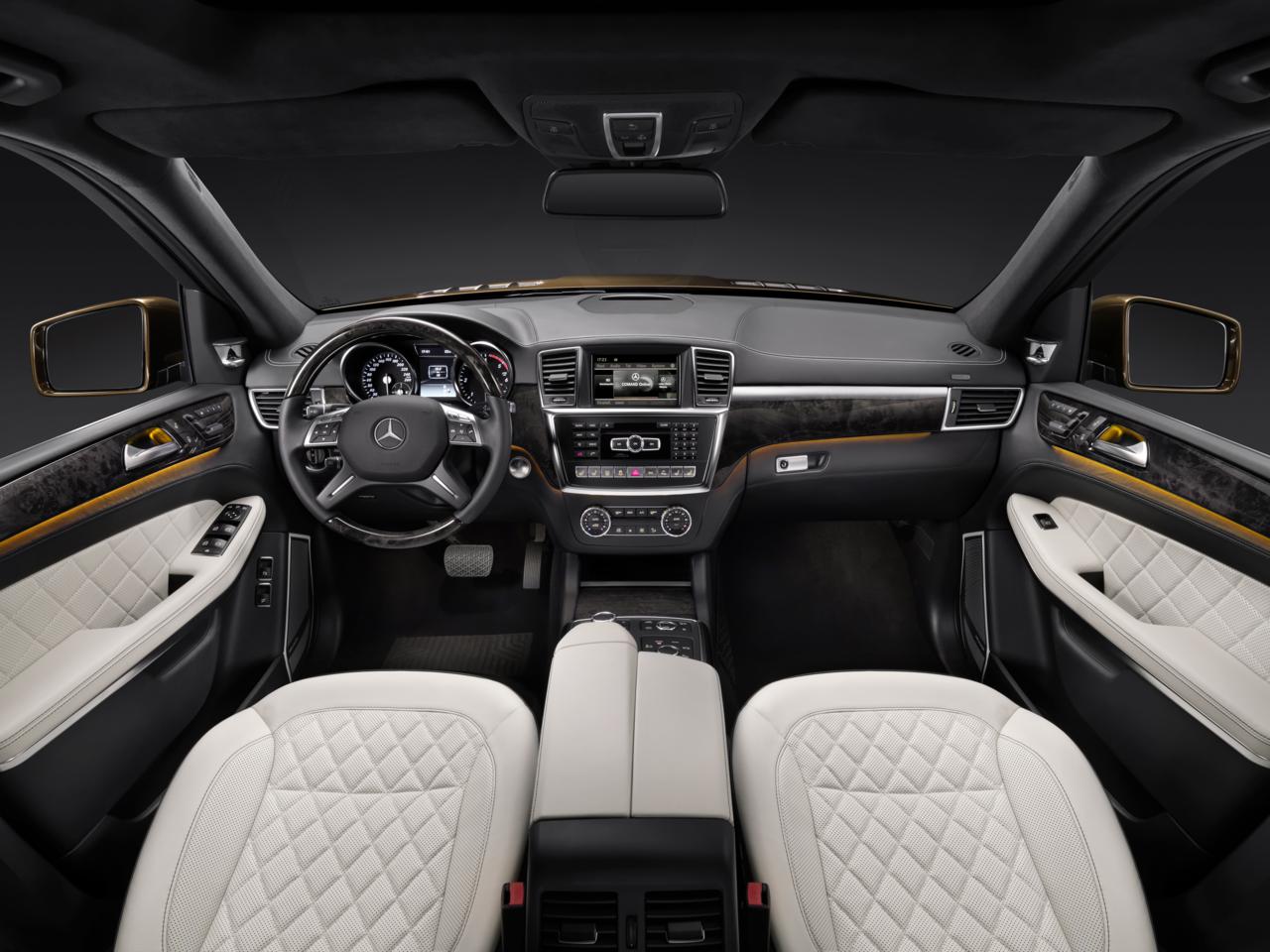 Gli interni della nuova Mercedes GL offrono un ambiente molto elegante e ben fatto, dove finiture e materiali pregiati si uniscono perfettamente. La vettura offre un’eccellente dinamica di marcia ed un elevato comfort, sia su strada che in off-road. La plancia è ben rifinita e nella parte centrale è stato posto lo schermo da 5,8″ pollici centimetri che ospita il sistema di infotainment COMAND Online, il quale può essere gestito tramite il controller posto al centro del tunnel centrale. Inoltre nel tunnel sono stati posti i pulsanti per il controllo delle sospensioni, del programma offroad e del sistema COMAND. La Classe GL offre sette posti comodi ed un abitacolo molto spazioso e versatile. Le modanature possono essere in legno o alluminio mentre i comandi possono avere superfici cromate color argento e rivestimenti traspiranti in pelle ecologica ARTICO con cuciture a contrasto.