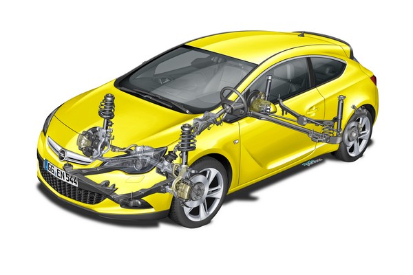 La vettura è dotata di telaio attivo FlexRide, il quale consente al guidatore di irrigidire gli ammortizzatori, lo sterzo e aumentare la risposta dell’acceleratore, semplicemente premendo i pulsanti “Sport” e “OPC” posti sulla plancia. Inoltre sull’asse anteriore è stato inserito un differenziale autobloccante che rende la OPC ancora più stabile e maneggevole rispetto alla GTC di base, assicurando alla vettura una maggiore aderenza in uscita dalle curve ad alta velocità. Infine i freni ad alte prestazioni Brembo assicurano eccellente decelerazione e massima stabilità, anche nei momenti di pressione intensa. Gli schemi sospensivi anteriore e posteriore della nuova Opel Astra GTC OPC sono i seguenti: