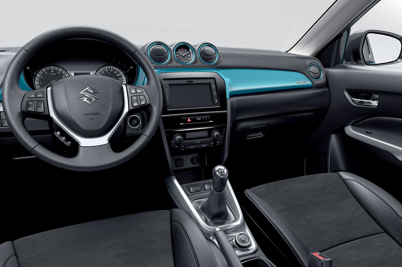 Gli interni della nuova Suzuki Vitara sono semplici e funzionali, perfetti per chi desidera uno stile senza troppi fronzoli. La plancia si sviluppa in orizzontale con un design semplice e nella stessa colorazione della carrozzeria esterna, accogliendo il display Touch-screen da 7″ pollici del sistema di infotainment. Le bocchette di ventilazione circolari hanno un aspetto retrò “anni ’90” ed è presenta anche il sistema di accesso Keyless con avviamento tramite pulsante. Al centro del tunnel centrale è inserito il selettore del sistema ALLGRIP, il quale offre quattro modalità in base alle condizioni del fondo stradale ed alle esigenze di guida, assicurando una guidabilità ottimale su strada e nei tratti off-road. Per quanto riguarda la sicurezza, debutta il sistema RBS (Radar Brake System), sistema che utilizza un radar per prevenire o attenuare le collisioni.