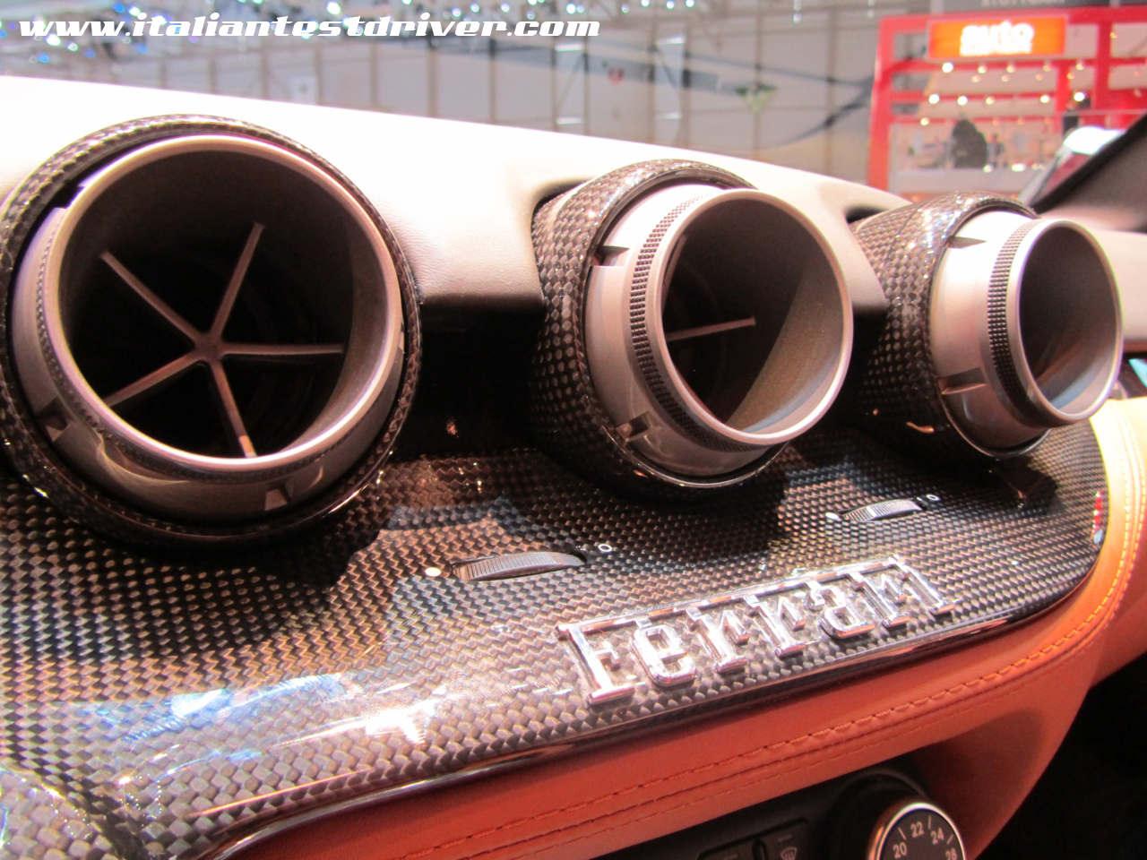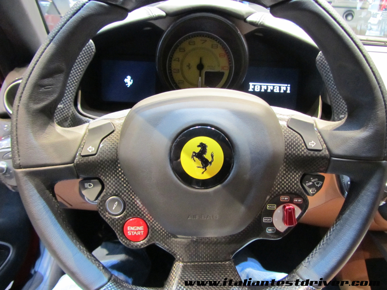 Il cruscotto è composto da due schermi lcd posti a lato del tachimetro centrale, i quali visualizzano tutte i dati relativi alla vettura. Come su tutte le ultime vetture del cavallino, il volante ospita tutte le funzioni principali da utilizzare durante la guida, come indicatori di direzione, accensione fari e motore ed il manettino grazie al quale si può scegliere ed impostare il comportamento globale della vettura. I sedili rivestiti in pelle Frau sono molto comodi e contenitivi, mantenendo un buon livello di comfort. Lo spazio interno è ampio anche per persone alte 1,95 metri e la visibilità è ottima. Il bagagliaio è ampiamente sfruttabile grazie al set di valigie fornite da Ferrari, le quali sono di ottima fattura e presentano il cavallino rampante in rilievo su ognuna. Molto curato il vano motore, completamente ricoperto in carbonio, il quale esalta il nuovo V12 Ferrari da 740 CV dipinto di rosso.
