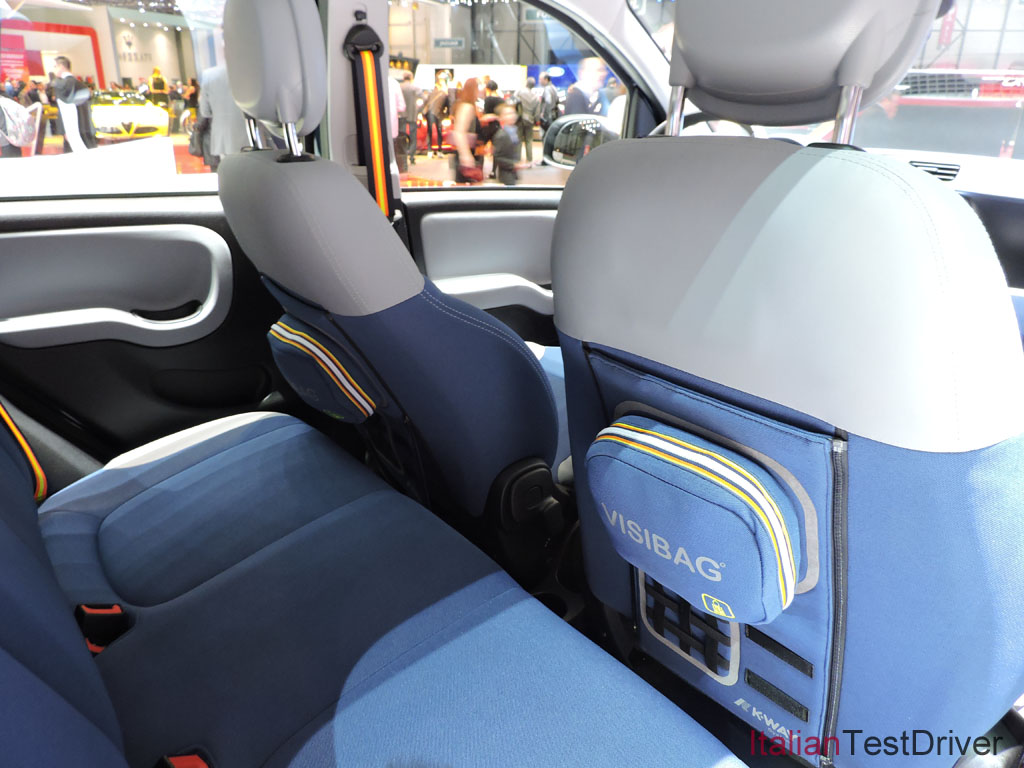 Gli interni sono davvero particolari, con una tinta bicolore grigio e blu per plancia e sedili. La tonalità blu utilizzata per la plancia è perlacea, caratteristica che le permette di essere blu o viola in base all’intensità della luce che entra nell’abitacolo. Numerosi i dettagli anche all’interno, come le cinture di sicurezza in tre colori, il logo K-Way su sedili e tappetini ma soprattutto le tasche che contengono i giubbini catarifrangenti “visibag”.