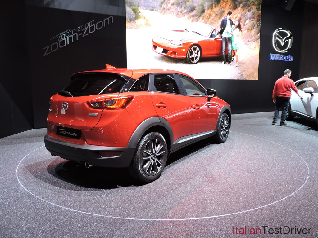 La Mazda CX-3 si presente con un look elegante e sportivo, unendo perfettamente sportività ed eleganza. La vettura è esposta nelle colorazioni bianco e rosso e, grazie al montante posteriore verniciato di nero, si ha un effetto “tetto sospeso” molto particolare.