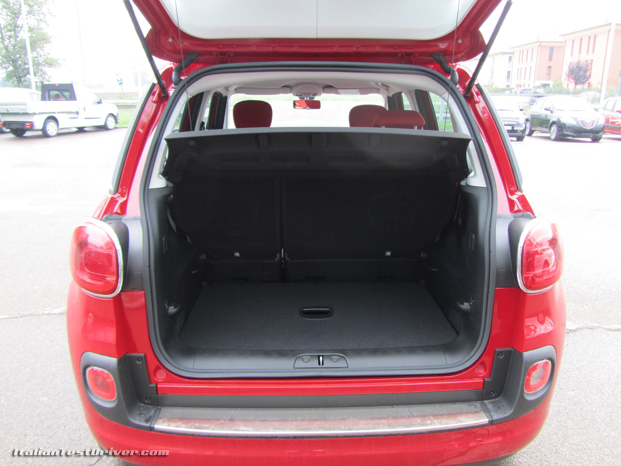 I doppi montanti anteriori permettono alla 500L di avere una visione davvero ampia della strada e di chi sta sopraggiungendo da destra e sinistra senza alcuna copertura di visuale, come invece accade su altre vetture. I sedili hanno un tessuto molto gradevole e ben fatto con il logo 500L e sono molto contenitivi e confortevoli. Tutte e quattro le portiere sono dotate di vani porta bibite, anche se le plastiche dei pannelli porta sono dure. La parte posteriore è davvero riuscita alla perfezione, rendendo la 500L completamente versatile e adatta ad ogni utilizzo. Lo spazio abbonda anche per tre passeggeri alti 2 metri, con vani portaoggetti ricavati nello schienale dei sedili anteriori e nel tunnel centrale. Il divanetto scorre avanti e indietro con il minimo sforzo ed è anche reclinabile, rendendo piacevoli anche i lunghi tragitti. Oltre a scorrere in avanti per aumentare la capacità del bagagliaio, il divanetto posteriore può essere completamente ribaltato con molta facilità, azionando un’apposita leva posta a lato dei poggiatesta posteriori. In un attimo, lo schienale si abbassa sul divanetto per ottenere un vano di carico completamente piatto compreso il sedile passeggero anteriore, tanto che la 500L è l’unica vettura della sua categoria ad aver superato la prova del “frigo”, prova che prevede il carico di un frigorifero sulla vettura.