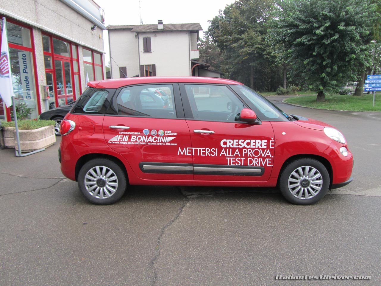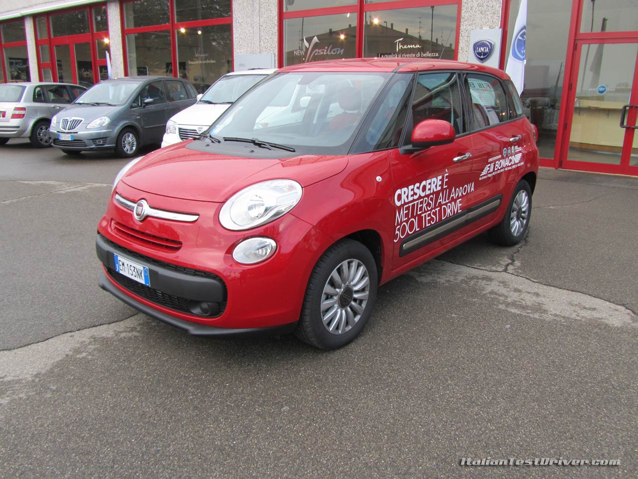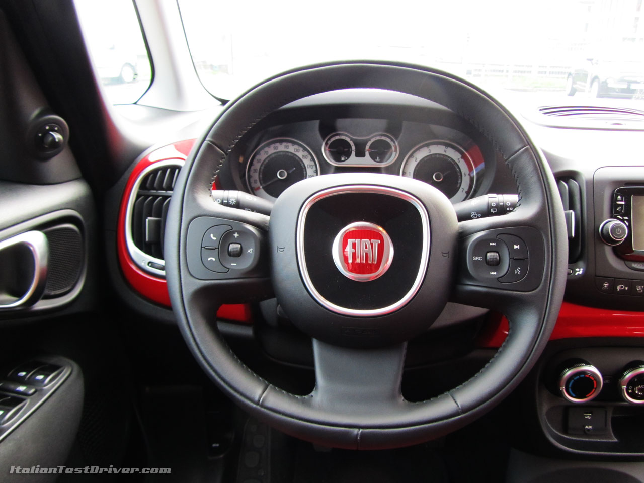 La Fiat 500L in prova offriva di serie il colore rosso passione pastello, i cerchi in lega da 16″ pollici ed il tetto in tinta con il resto della carrozzeria. Lo stile esterno è elegante e ben fatto, il quale permette alla 500L di uscire dagli schemi delle “solite” monovolume, offrendo una vettura dal design ricercato e “cool” che difficilmente si trova su auto di questo genere. Grazie a questa peculiarità, la 500L è stata ordinata da clienti con gusti molto differenti, i quali avevano come precedente vettura una cityca, una compatta di segmento C, una berlina o una monovolume. L’anterioreè una chiara evoluzione degli stilemi della Fiat 500 ed è caratterizzato da nuovi fari dalla forma ovale e da nuove luci diurne. Al centro è stato inserito il “baffo” cromato centrale che ospita il logo Fiat, mentre nella parte inferiore del paraurti è stata inserita una brande presa d’aria che ospita i fari fendinebbia. I doppi montanti anterioriai lati del parabrezza sono molto funzionali e permettono di avere una visuale più ampia rispetto ad un parabrezza tradizionale.