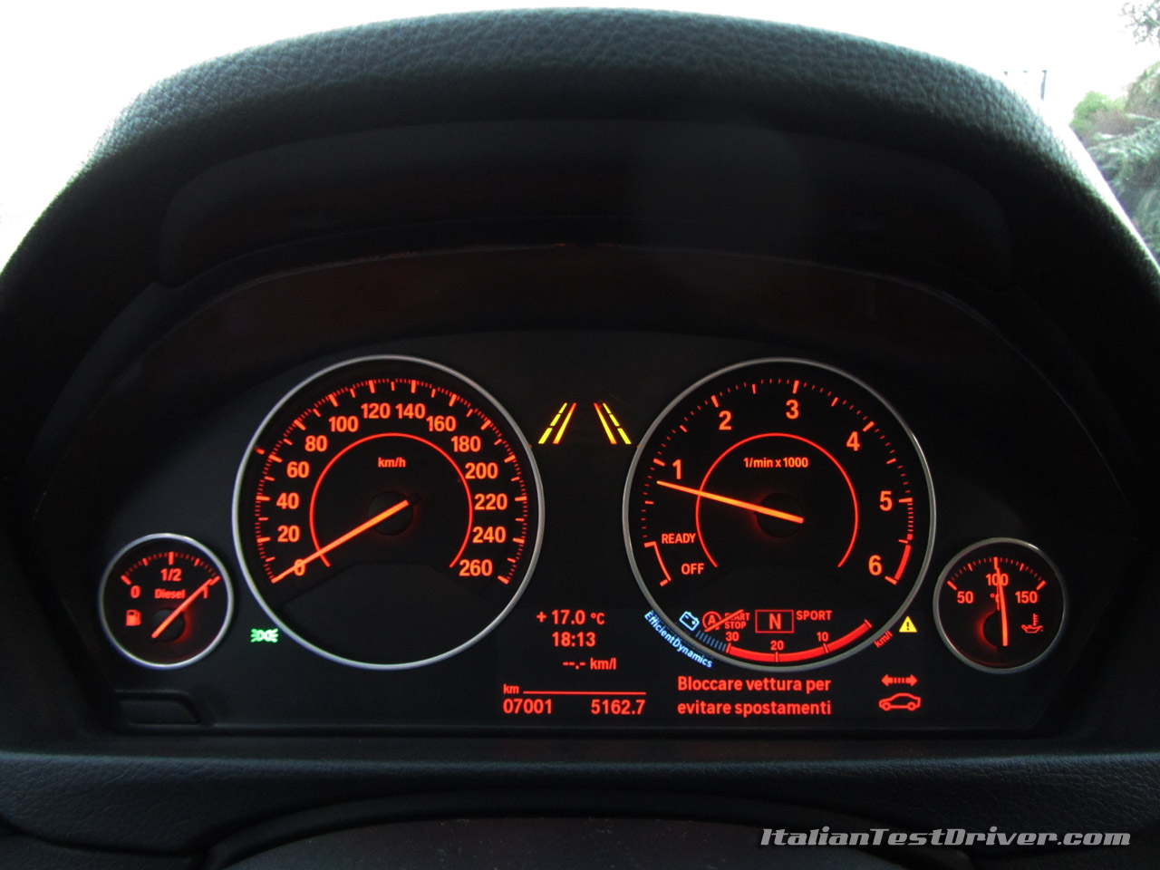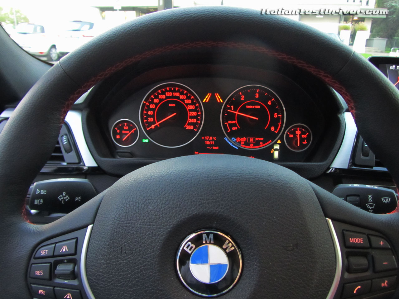 Seduti al volante della Serie 3 Touring, ci si accorge subito che si è seduti all’interno di una sportiva, con una seduta molto bassa, sedili contenitivi e molta tecnologia a bordo. In pochi secondi si trova la posizione di guida grazie ai comandi elettronici e si è pronti per partire. Per avviare la vetture si preme sul pedale del freno, si toglie il cambio dalla modalità Parking e si inserisce la modalità automatica “D” e si preme il pulsante Start. Il motore si avvia nel più totale silenzio e non appena si toglie il piede dal freno, la vettura inizia ad avanzare a bassa velocità. Rispetto ad altri cambi automatici, le basse velocità si regolano agendo sul pedale del freno, mentre in altri cambi automatici la vettura prende velocità solo premendo l’acceleratore. In un attimo si prende confidenza con il cambio e con l’assenza del pedale della frizione e ci si trova subito a proprio agio.