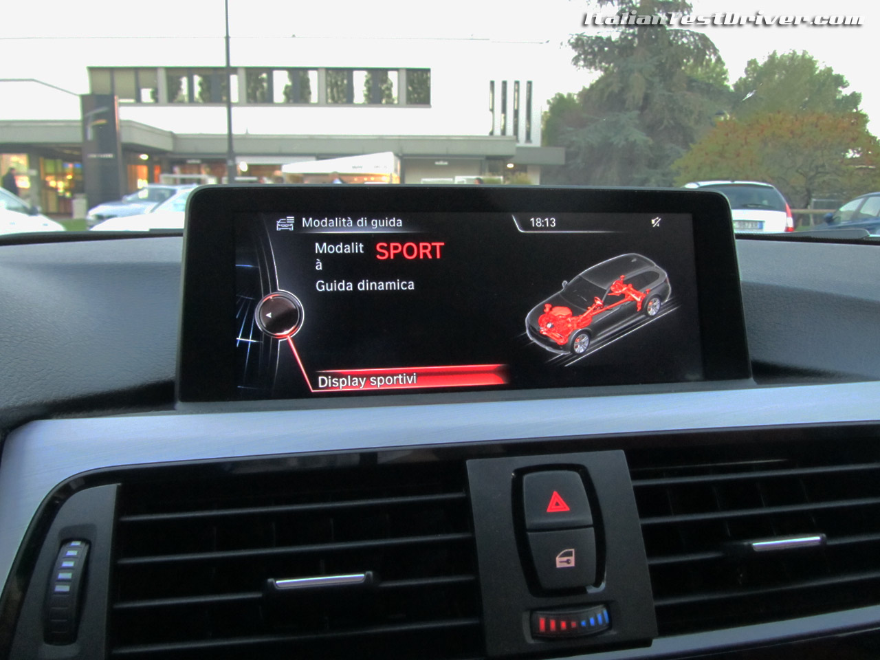 Gli interni della Serie 3 Touring sono in allestimento Sport Line, allestimento che unisce perfettamente l’eleganza con la sportività. L’abitacolo offre un ambiente elegante e ben fatto, dove materiali di ottima qualità ed inserti in alluminio satinato si fondono perfettamente senza la minima imperfezione o sbavatura. Lo stile generale è lo stile “minimal” caratteristico delle vetture tedesche, ma in questo caso il design è ricercato e ben fatto. Il volante è ben realizzato e impreziosito da un inserto di alluminio nella parte bassa e dalle impunture rosse a contrasto. Inoltre ospita tutti i comandi per utilizzare il sistema di infotainment BMW ConnectedDrive ed i dispositivi per l’ausilio alla guida, come l’Active Cruise Control, comandi vocali, trip computer e avvisatore di cambio accidentale di corsia. Molto utile anche la proiezione sul parabrezza della segnaletica stradale, dei limiti di velocità e delle indicazioni del navigatore satellitare, permettendo a chi guida di non distogliere mai lo sguardo dalla strada. Nella parte centrale della plancia è stato inserito l’Head-up display da 8.8″ pollici, il quale integra tutte le funzioni della vettura e le modalità di funzionamento Eco Pro, Comfort, Sport e Sport+, attivabili tramite due appositi pulsanti posti sul tunnel centrale.