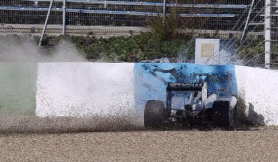 Le temperature erano tra i 12 ed i 15°C e tanta umidità. Il primo pilota a scendere in pista è stato Lewis Hamilton sulla nuova Mercedes W05, la quale presenta un musetto anteriore molto simile a quello della Ferrari F14-T. Il pilota Inglese ha affrontato il primo giro con molta calma tenendo il motore a bassi regimi, nel secondo giro invece ha cominciato a cercare la confidenza necessaria sia con la monoposto, sia con la nuova erogazione di questo motore turbo. Il secondo a scendere in pista è Kimi Raikkonen con la sua F14-T ma, dopo poche curve, è stato costretto ad abbandonare la sua monoposto a bordo pista su ordine della scuderia. Gli ingegneri Ferrari infatti hanno fatto spegnere in via precauzionale il motore. Poco dopo debuttato anche Vergne ( Toro Rosso) e Perez (Force India). Come successo alla Ferrari però, dopo poche tornate anche la Force India viene fatta fermare, seconda bandiera rossa di giornata. In Ferrari sistemano i parametri della F14-T e Raikkonen rientra in pista per 31 giri. La prima notizia eclatante di giornata è l’incidente di Lewis Hamilton, avvenuto a causa di un cedimento dell’ala anteriore. La monoposto è andata a sbattere violentemente contro le barriere e fortunatamente il pilota ne è uscito illeso. La sua Mercedes invece è stata pesantemente danneggiata, concludendo il primo giorno di test per la scuderia Tedesca. Nonostante l’accaduto, Hamilton ha rilasciato alcune dichiarazioni molto positive riguardanti la nuova monoposto e il lavoro svolto dal team. Durante la mattinata, sono state presentate la nuova Red Bull RB10, la nuova Mercedes W05 e la Caterham CT05.
